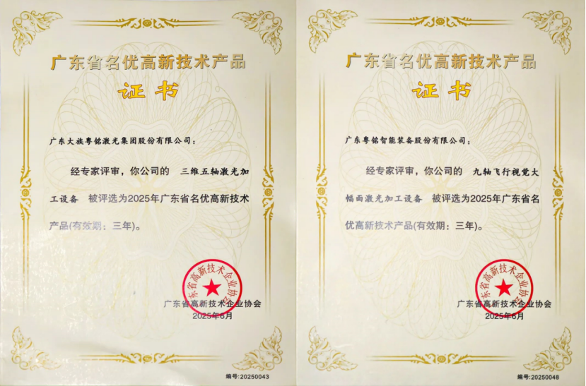 近日,广东省高新技术企业协会正式公布了2025年第一批广东省名优高新技术产品评选结果。“广东大族粤铭激光集团股份有限公司”和旗下子公司“广东粤铭智能装备股份有限公司”双双上榜,分别凭借自主研发的“三维五轴激光加工设备”和“九轴飞行视觉大幅面激光加工设备”两款高性能设备,成功入选“广东省名优高新技术产品”名单!