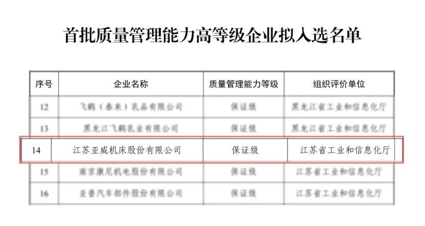 日前,工信部公示了43家全国首批质量管理能力高等级企业拟入选名单,亚威股份成功入围。