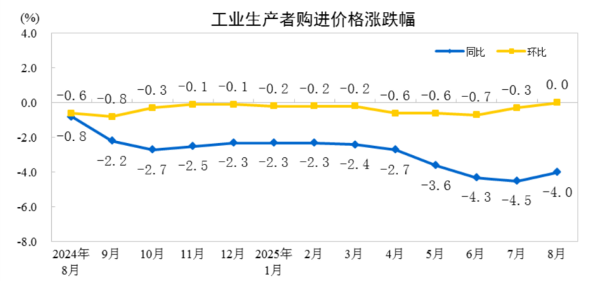 【钱柜qg777栏目 市场分析】2025年8月份,全国工业生产者出厂价格同比下降2.9%,降幅比上月收窄0.7个百分点,环比由下降0.2%转为持平。工业生产者购进价格同比下降4.0%,环比持平。1—8月平均,工业生产者出厂价格比上年同期下降2.9%,工业生产者购进价格下降3.3%。