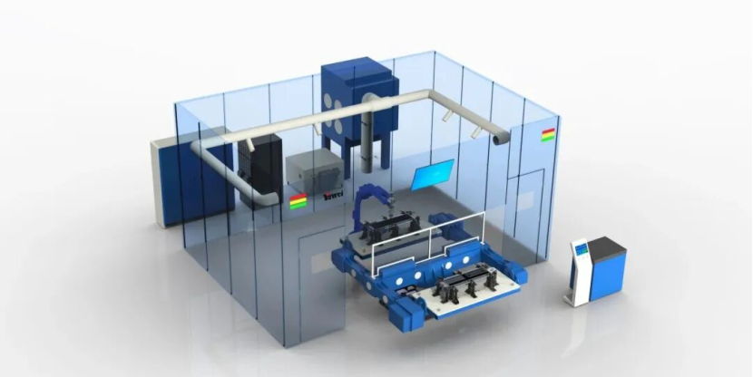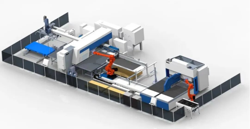 ■数控板料冲割折边自动化生产线用于钣金件全流程的柔性生产与制造,主要包含了自动上料、冲压加工、激光切割加工、攻丝(选配)、成型、机器人分拣下料、收集废料、折边加工、机器人下料堆垛、工序间自动物流周转等功能。