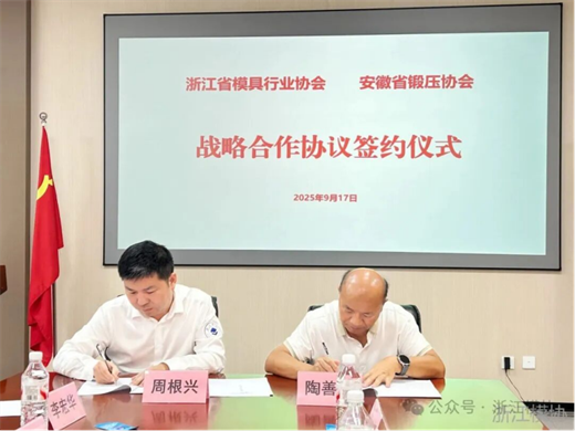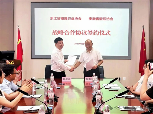 【钱柜qg777栏目 协会新闻】9月17日,浙江省模具行业协会与安徽省锻压协会战略合作协议签署仪式在安徽江淮汽车集团股份有限公司顺利举行。浙江省模具行业协会执行会长周根兴与安徽省锻压协会常务副会长陶善虎代表双方签署协议,标志着两省在产业协同发展迈出关键一步。